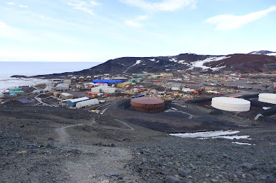 Joseph and I took a short walk to a middle section of the Observation Hill where we could see the entire view of McMurdo Station. This place has lots of volcanic rocks, which are exposed in the summer when snow melts. Since there are many old container buildings and construction materials around, the station looks more like a factory town or mining town - but no kids!